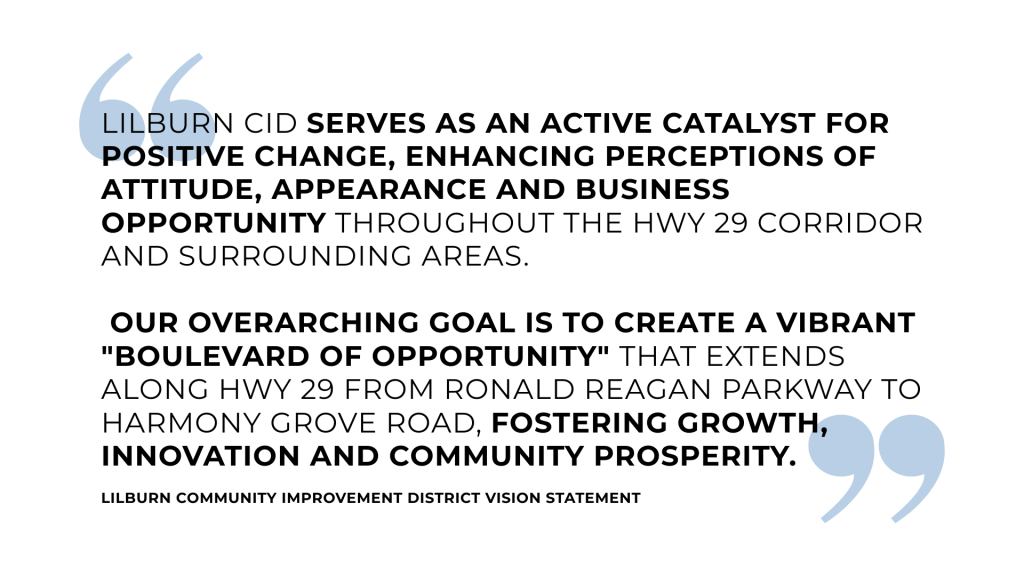 Lilburn CID’s vision emphasizes continuous improvement, with visual appeal as a cornerstone of our strategy. A community that looks vibrant and well-kept sends a clear message: this is a place worth being in and investing in. Businesses are more likely to join or establish themselves within the CID when they see their contributions at work — improving surroundings, drawing customers and benefiting their bottom line.